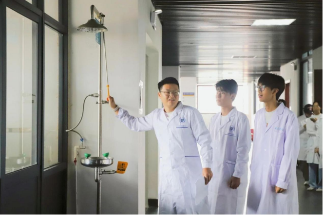 靳磊老师为同学们讲解了遇到酒精灯倾倒火势蔓延和实验中衣物着火时的应急措施的使用方法,并介绍了实验室的洗眼器和喷淋装置的使用方法。