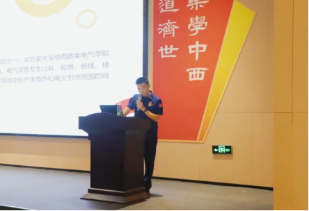 郭站长从用电安全、化学品安全、用气安全、消防安全说明实验室消防安全管理该从哪几个方面进行;讲述了如果发生消防安全事故应当如何处置,在传授消防栓及灭火器使用方法的同时,也告知四种基本灭火方法的原理。