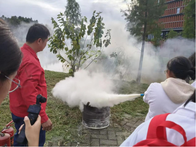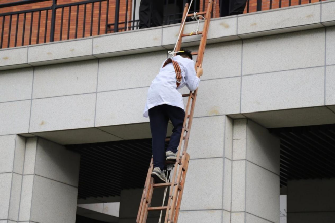 在消防队员和安保的带领下同学们学习了灭火器、灭火毯和云梯的使用。