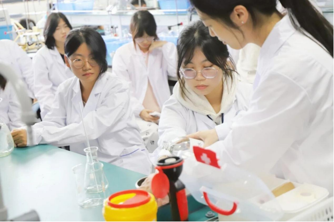 王萍和陈映彤老师为同学们演示了在化学试剂溅入眼睛和实验室被玻璃碎片划伤的应急操作。
